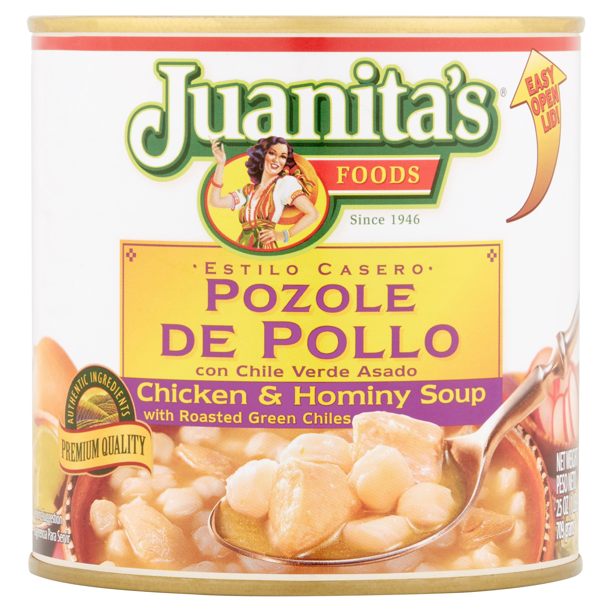 Juanita s makes a pozole for everyone in your family choose from pork or chicken with green or red chiles. Bring the water to a boil and then reduce the heat to a simmer. Pozole sometimes spelled posole in the us is the name of both a mexican stew and the main ingredient in that stew. Ingredients olive oil 1 medium onion diced 1 tablespoon minced garlic about 5 6 cloves 4 cups shredded cooked chicken like from a rotisserie 2 25 ounce cans hominy drained 64 ounces chicken stock 1 15 ounce can enchilada sauce 2 teaspoons caldo de tomat tomato bouillon 1 teaspoon dried oregano 1 2.