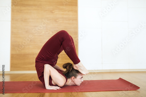 Young Attractive Woman In A Red Suit Practicing Yoga Standing In Scorpion Exercise Vrischikasana Pose Working Out Wearing Sportswear Indoor Full Length In The Gym Side View Buy This Stock Photo