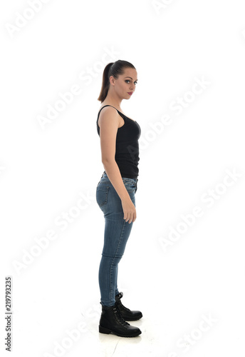Full Length Portrait Of Brunette Girl Wearing Black Single And Jeans Standing Pose In Side Profile Isolated On White Studio Background Buy This Stock Photo And Explore Similar Images At Adobe