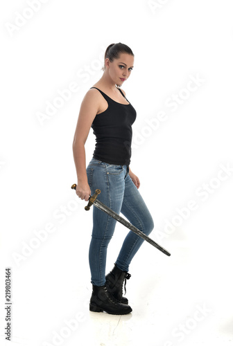 Full Length Portrait Of Brunette Girl Wearing Black Single And Jeans Standing Pose Holding A Sword Isolated On White Studio Background Buy This Stock Photo And Explore Similar Images At Adobe