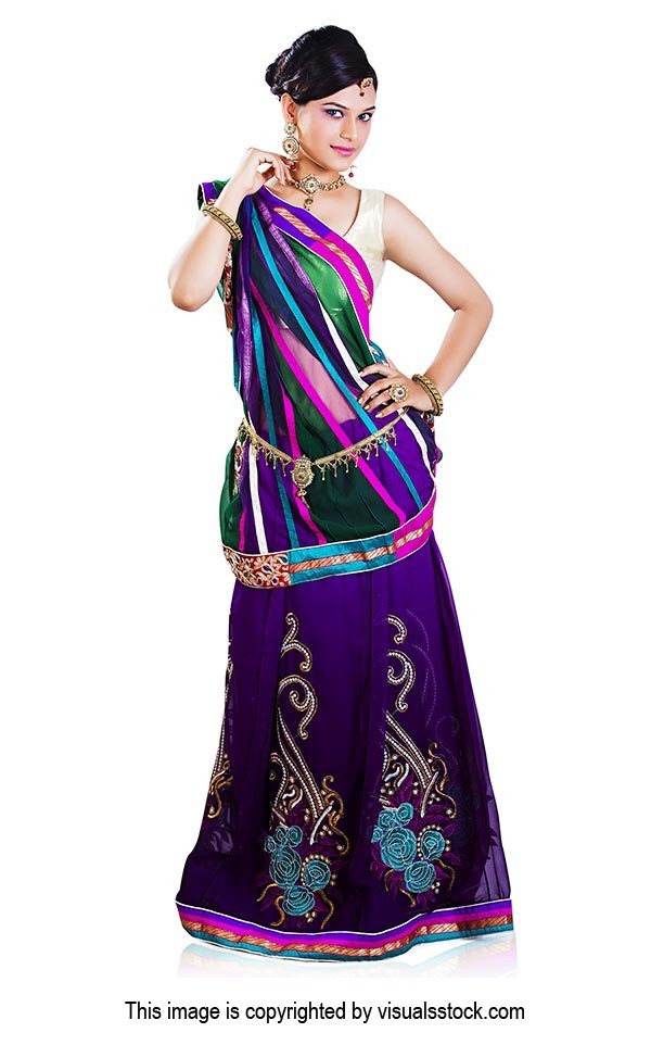 Full Length Indian Beautiful Lady Traditional Saree With Jewellery Standing Pose
