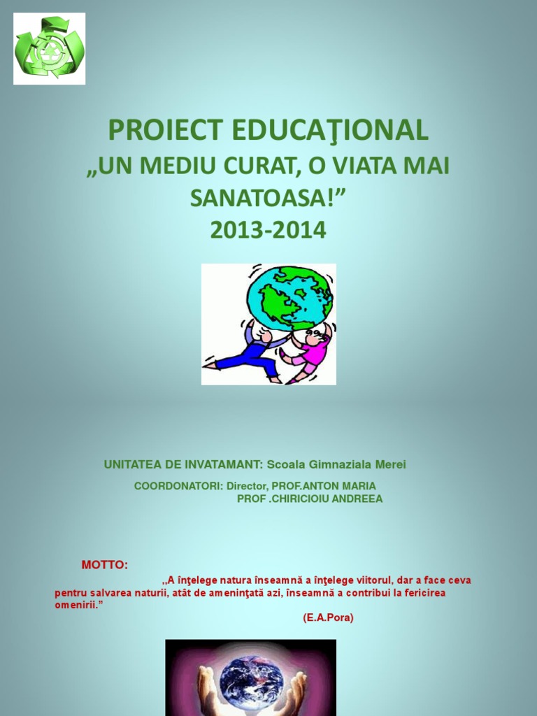 Proiect Educaţional Un Mediu Curat O Viata Mai Sanatoasa 2013 2014